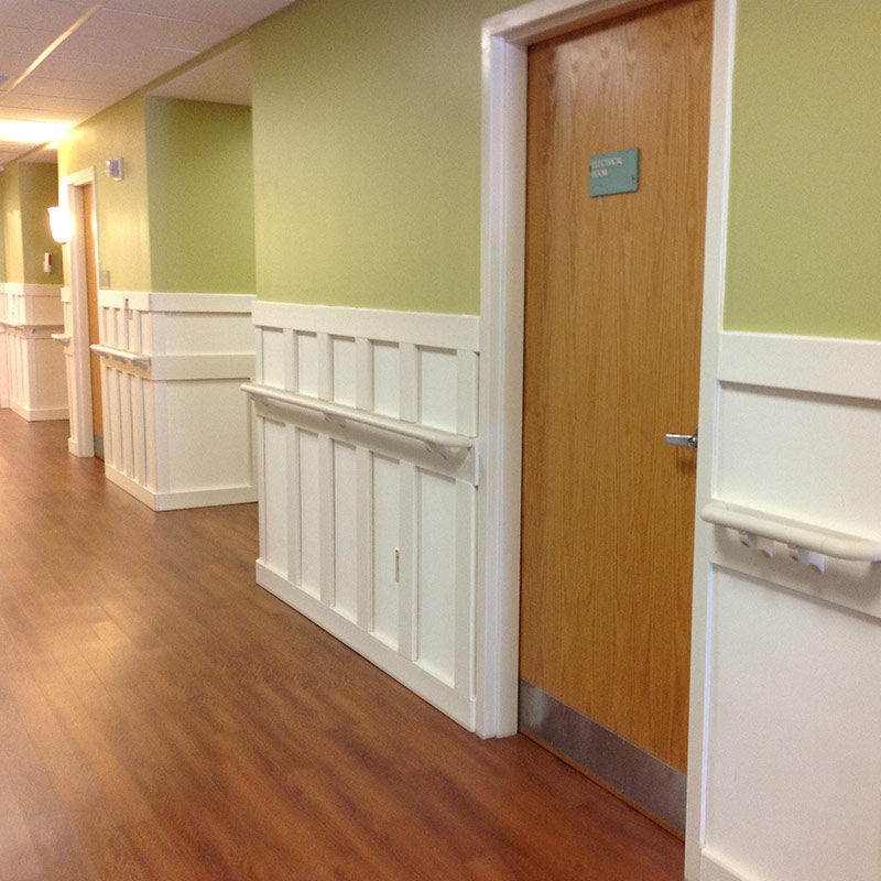 The distinction between crash rails and bumper guards/chair rails is somewhat arbitrary. Wall protection items safeguard walls from impact and help prevent damage from chairs, carts, and doors. Colored matched caulk 70 colors. Chair rails wall base handrails. 8 ft (2.4 m) heat stability: